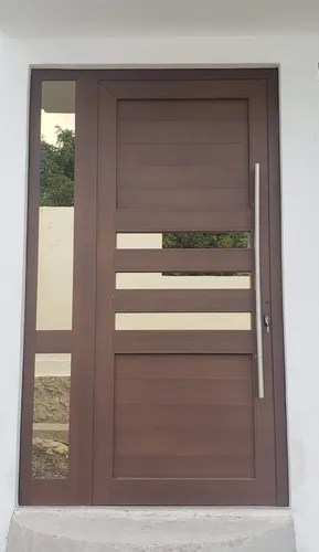Puerta de exterior de iroko en color nogal claro con tarima vertical y dos mantos a 45º con 2 plafones con forma de diamante y fijos irregulares a ambos .